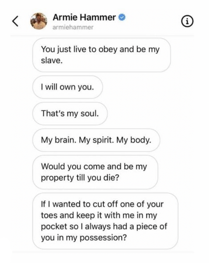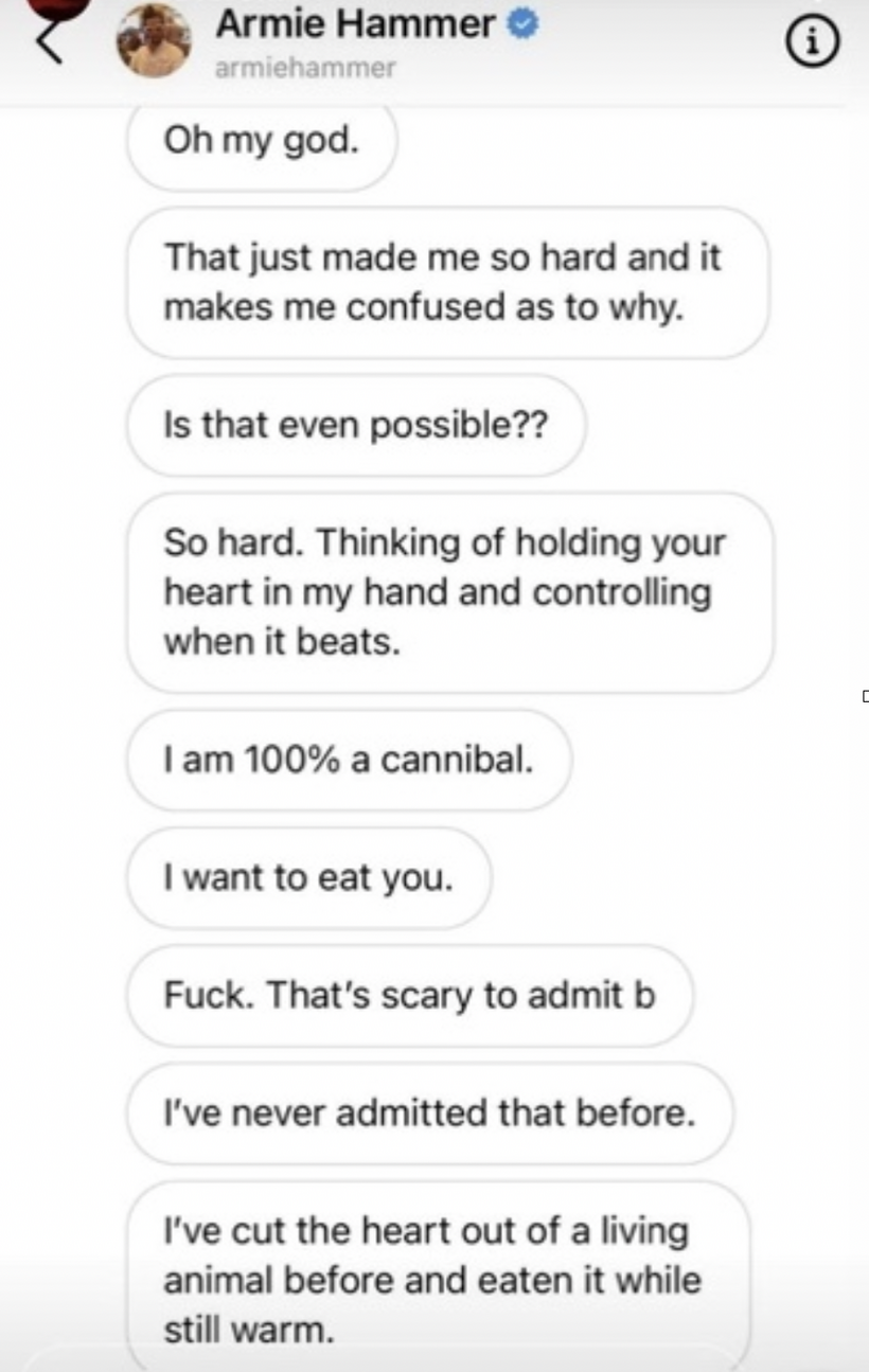 Obviously, the Instagram Story is Hammer more or less telling on himself as his interest in vore has basically tanked his career. In 2021, the Call Me By Your Name actor wasn’t only accused of violent rape and physical abuse by a former partner (Hammer was later declared not guilty), but rumors and unverified screenshots started circulating highlighting Hammer’s alleged cannibalism kink on the accounts of multiple women he’d been communicating with (he supposedly told some of them that he wanted to cook them alive and that he “craved blood”).