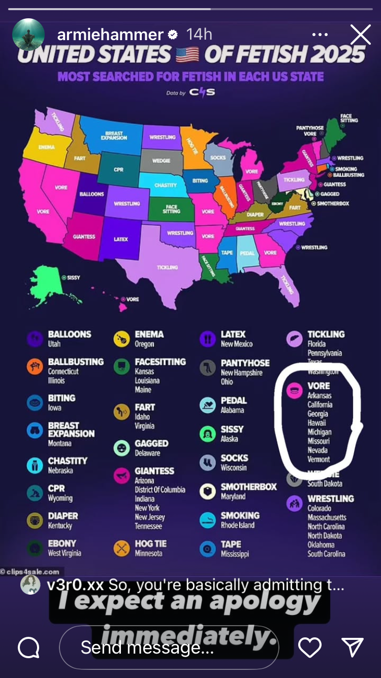 A few hours ago, Hammer took to Instagram to post a Story with a map of the U.S. that he claims proves that vore is an incredibly popular fetish. “I expect an apology immediately," he wrote over the map detailing the most searched for fetishes in each state. According to said map, “vore” takes the top spot in Arkansas, California, Georgia, Hawaii, Michigan, Missouri, Nevada and Vermont.