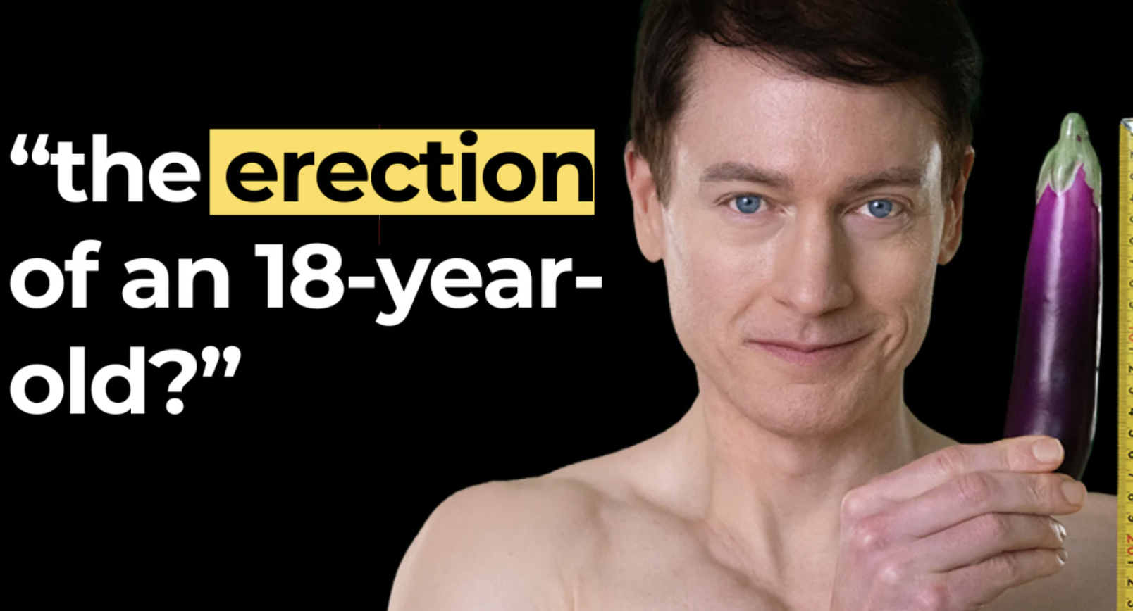 Johnson’s tips on “de-aging your penis” are handily collated in a blog post, alongside a photo of his smoothed-out, smiling face clutching an eggplant, with the tagline: “The erection of an 18-year-old?” While not billed as such, the post is essentially an ad for a creepy-looking product called Adam, “the world’s first night-time erection tracker.”