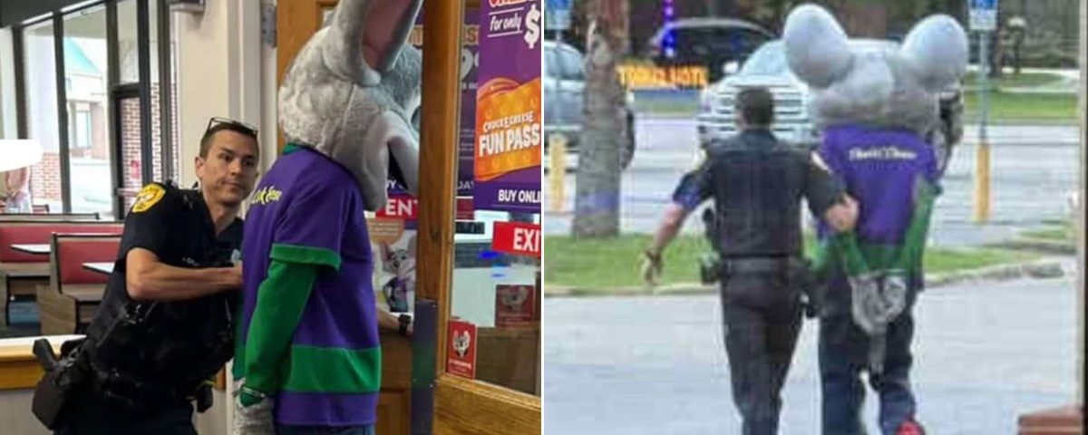 Jones, who was supposedly working a child’s birthday party at the time of his arrest, was escorted out of the Chuck E. Cheese before his mouse head was removed and he was placed in handcuffs, which is a pretty brutal way for some poor kid’s birthday party to end.
