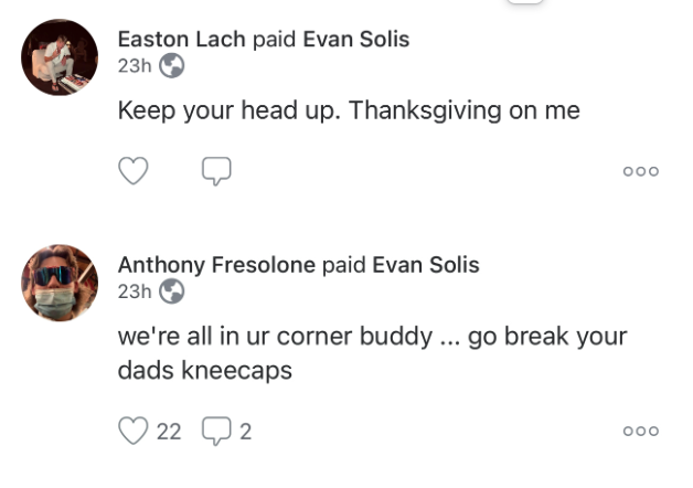 That didn’t stop the Venmo payments, though, which continued for another day. “We’re all in ur corner buddy. Go break your dads kneecaps,” reads one with 22 likes. “Bang her mom, that’s what I would do! Head up buddy,” proclaims another with 31 likes; “Buy some coffee Zyns with this, you deserve it boss man,” offers a third with 17 likes. (It’s also worth noting that at some point on February 26th, Solis’ Venmo account was labeled as “inactive,” meaning it was either frozen or deactivated. But the label is now gone, and the account is back up.)