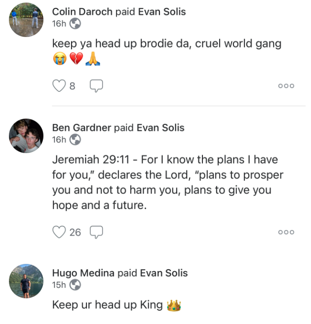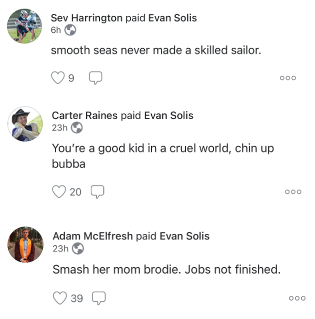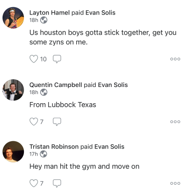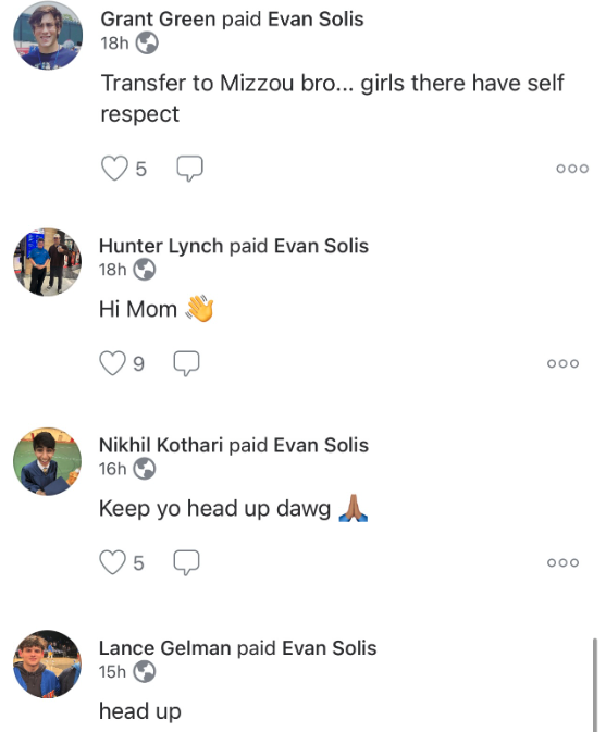 The bros dropping cash and pick-me-ups in Solis’ account appeared after a rumor went viral that his girlfriend Mary Kate Cornett, a student at Ole Miss, had cheated on him with his father. Cornell and Solis, however, both say this rumor is blatantly untrue.