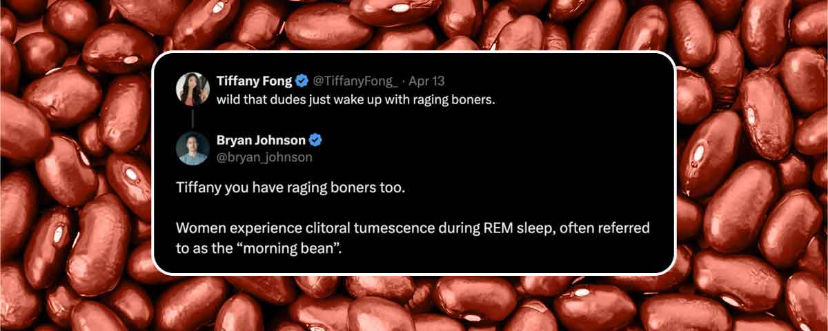 Not long afterward, she was met with a surprising response from Bryan Johnson, the wealthy entrepreneur famous for trying to biohack his way out of aging and ultimately “conquer death.” “Tiffany you have raging boners too,” Johnson wrote. “Women experience clitoral tumescence during REM sleep, often referred to as the ‘morning bean.’”