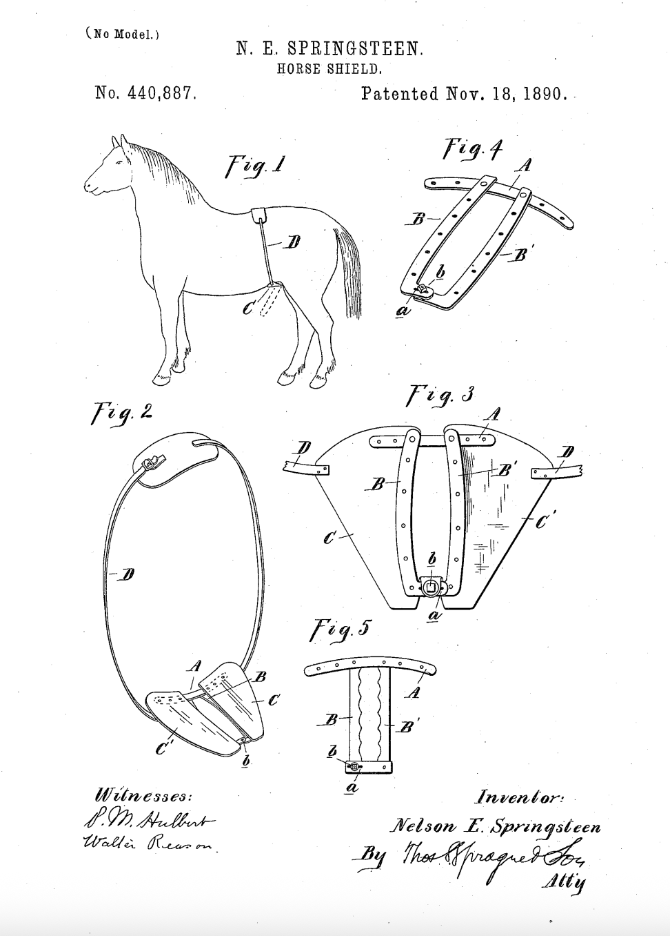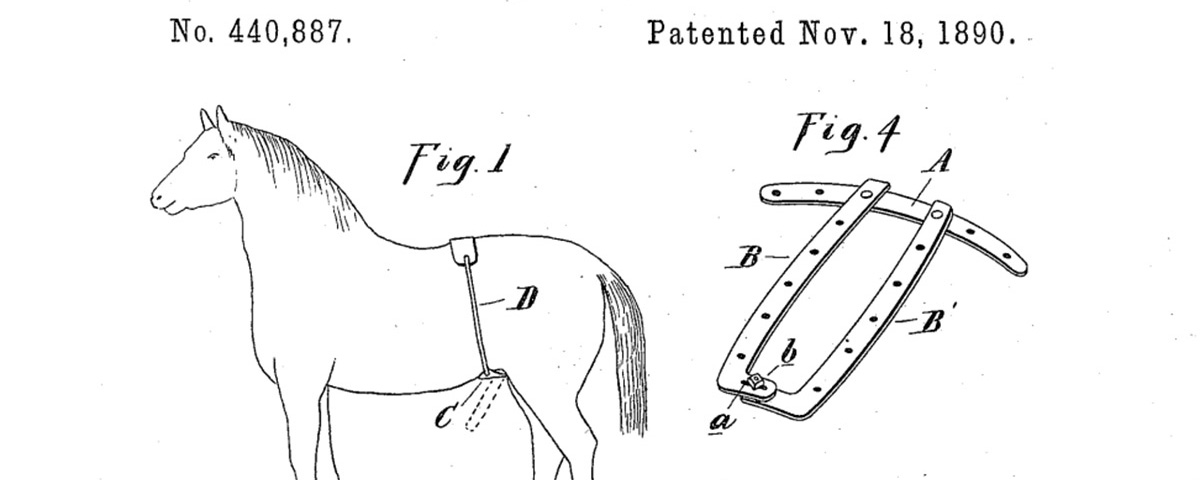 In 1890, a guy named N.E Springsteen filed a patent for a so-called “horse shield,” designed to “prevent stallions from abusing themselves.” The patent comes with a very rudimentary drawing of a smiley-faced horse with a strap around his torso, and a schlong-sized outline to demonstrate a sort of chastity cage. Apparently, abstinent horses are happy horses. The shield itself has “rigid sides large enough to allow the animal to make any necessary projection in urinating, but of such restricted size that, should the extended parts enlarge, the rigid sides will press into the flesh, giving pain sufficient to cause the animal to desist.”
