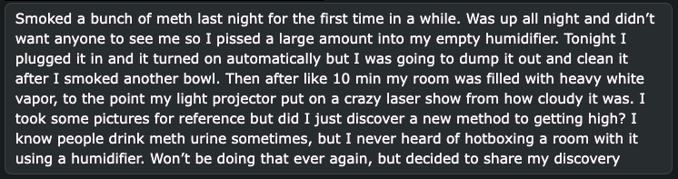 For context, on Reddit, joshsexxy made a post simply titled “This May Sound Extremely Dumb, But I Peed in My Humidifier After Smoking Meth” (he’s pretty straightforward). In the post, he details how he peed into his humidifier while on meth, then plugged it in the next day (while also on meth). To his surprise, his room quickly filled with pee vapor, which he promptly illuminated with laser lights. In his post, he speculated that maybe, *maybe* doing this got him a little higher than meth alone.