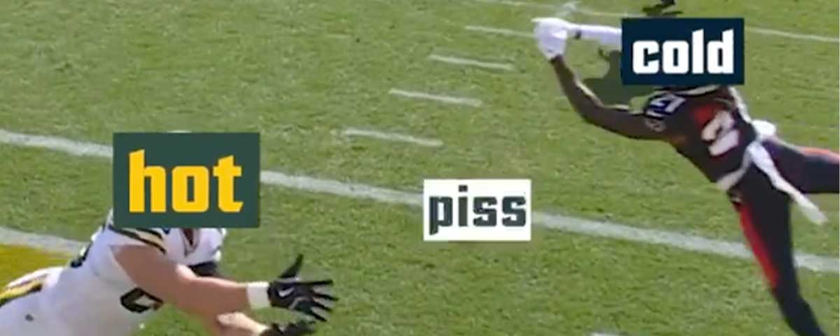 And it’s even been embraced by the team itself, as the Packers’ official Twitter account now proudly uses hot piss as a way to talk shit after a big win against the Houston Texans. Because when life gives you hot piss, make memes.