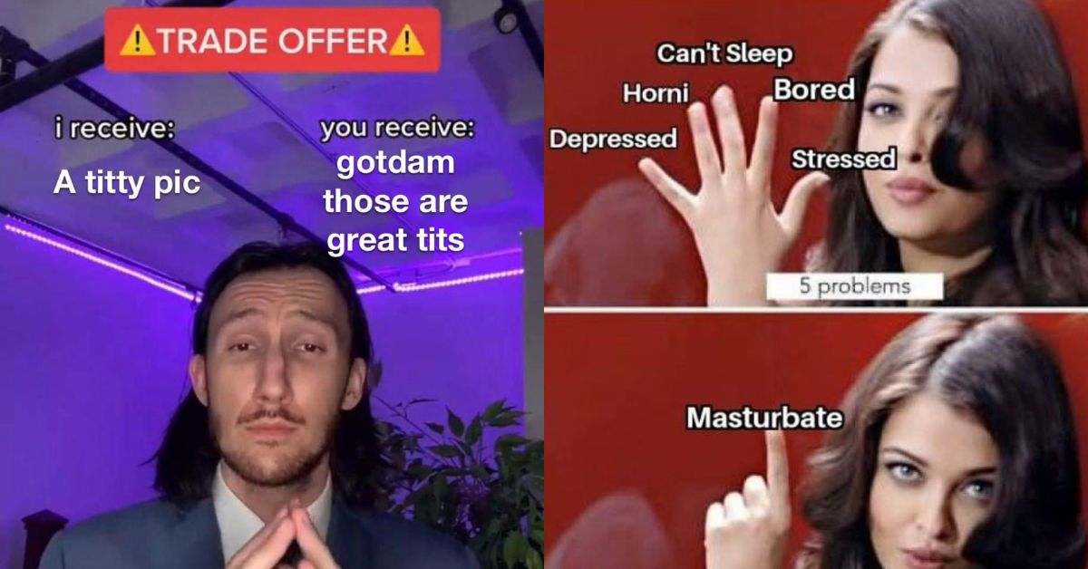 These NSFW memes are so unhinged they should come with a safeword. They're loud, horny, and aggressively funny, much like your favorite ex. You might want to hide your screen, but we both know you're too far gone.